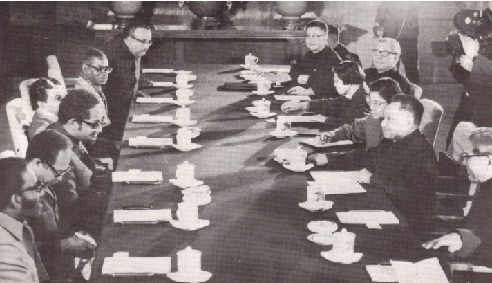 Welcoming the distinguished Guyanese guests at the airport upon their arrival in the Chinese capital were Vice-Premiers Teng Hsiaoping and Chen Yungkuei, Vice-Chairman Tan Chen-lin of the Standing Committee orated with welcome slogans: “Firm support for the Guyanese people in their struggle to safeguard national independence and state sovereignty!”, “Long live the friendship between the peoples of China and Guyana!”, “Long live the great unity of the third world people!”, “Long live the great unity of the people of the world!